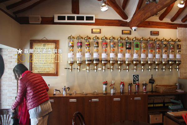 牆上有裝各種咖啡豆的容器。